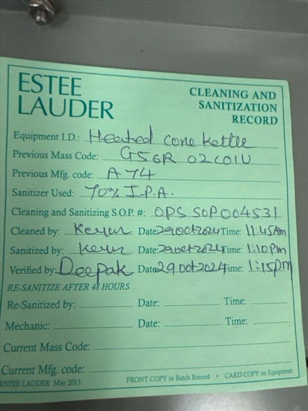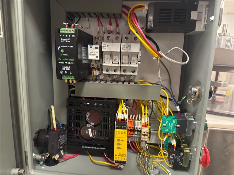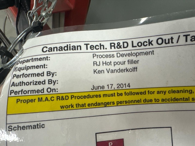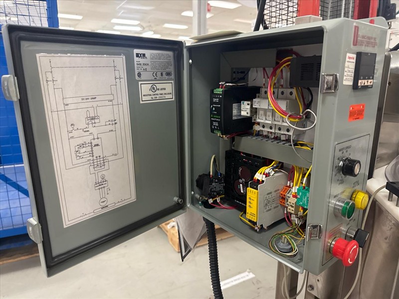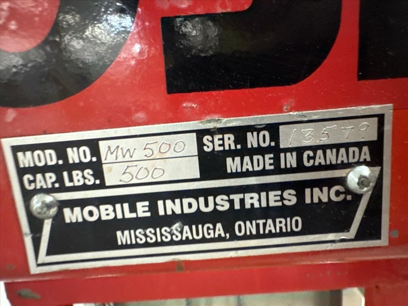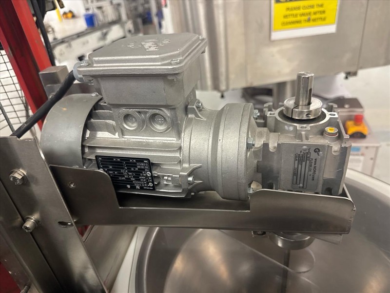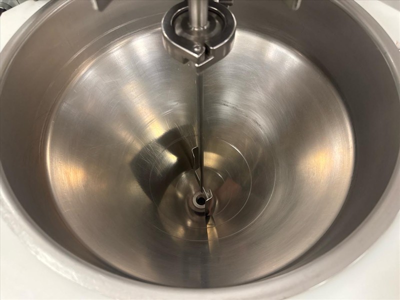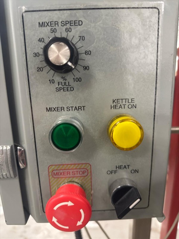 R-J Machinery Inc. Electrically Heated Cone Kettle, ser.no. 2120714, kettle size approximately 16 in. W x 16 in. D, stainless steel, c/w overhead stirrer, 0.16 hp, w/ Mobile Industries inc. Manual Winch Stacker, mod. MW 500, 500 lb. cap.