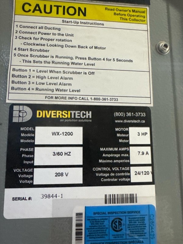 Diversitech Wet Dust Collector, mod. WX 1200, ser.no. 39844-1, 3 hp, 20 gal., on casters