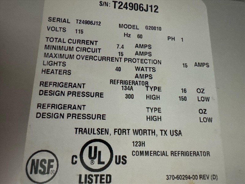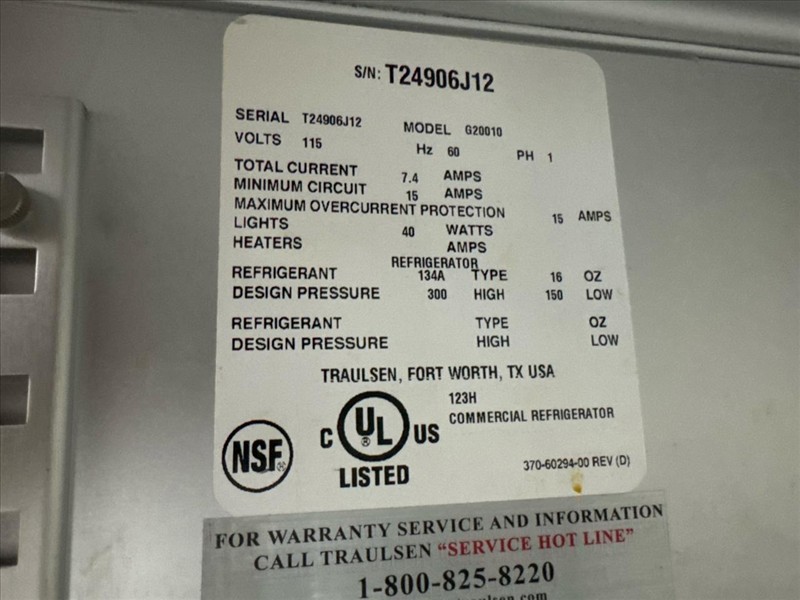 Traulsen 2-Door Solid Reach In Refrigerator, mod. G20010, ser.no. T24906J12, Approximately 52 in. W x 33.5 in. D x 83.5 in. H