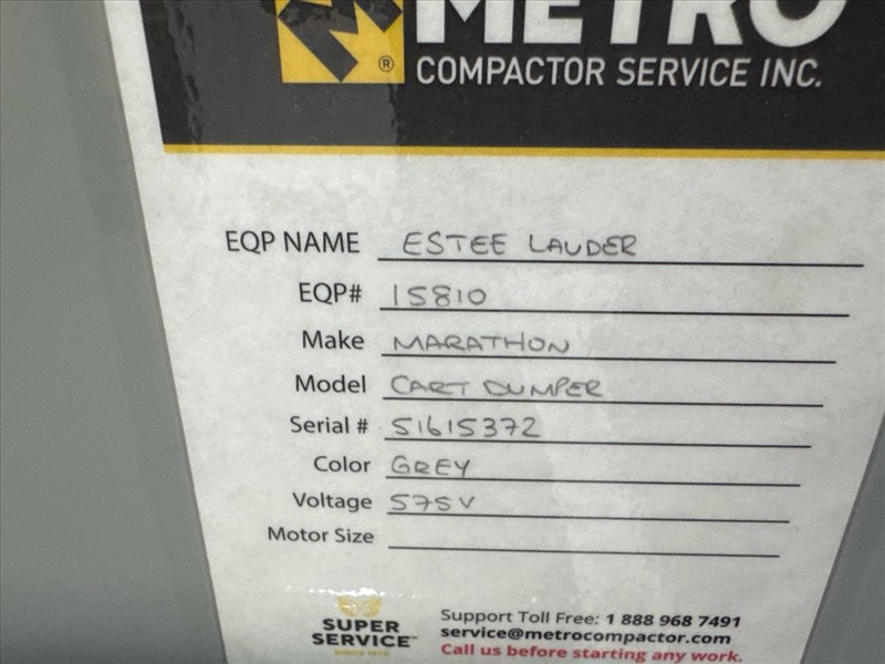 Marathon Trash Compactor Waste Cart Dumpers, mod. STDCD, ser.no. 51615372 (2021), cart measurement approximately 37 in. W x 54 in. D x 65.5 in. H c/w hydraulic pack [Subject to Confirmation]