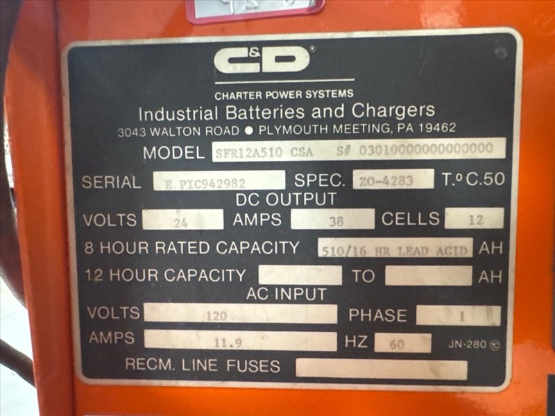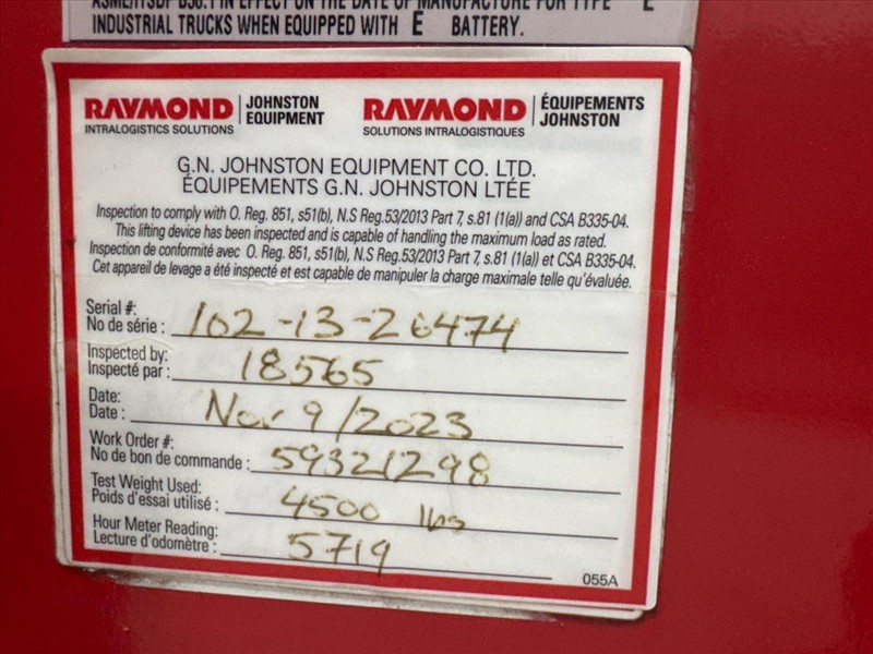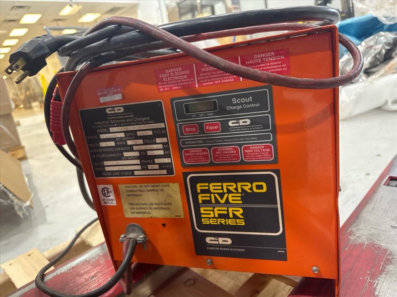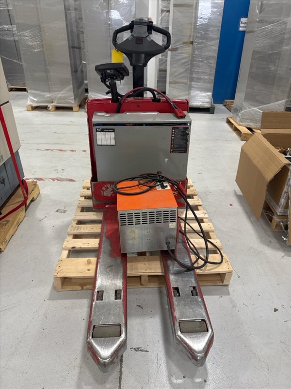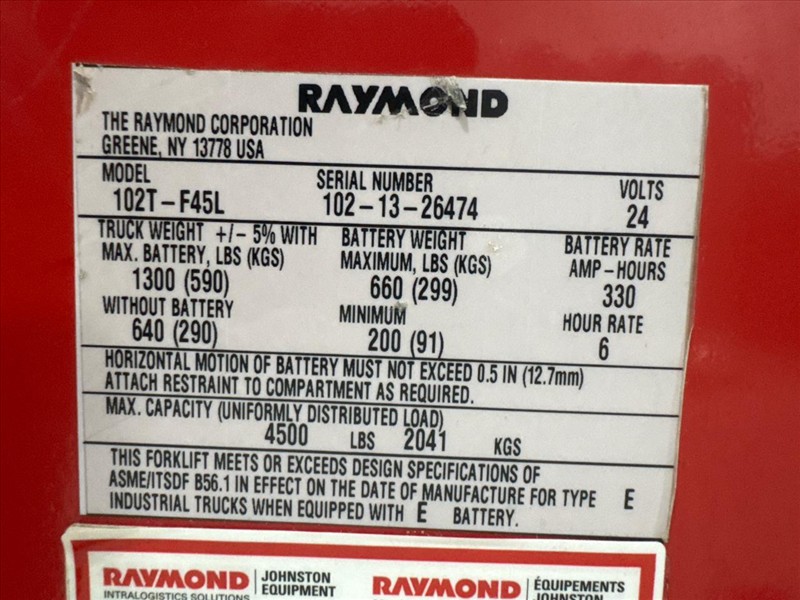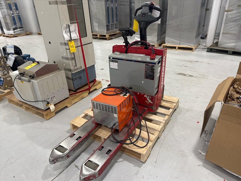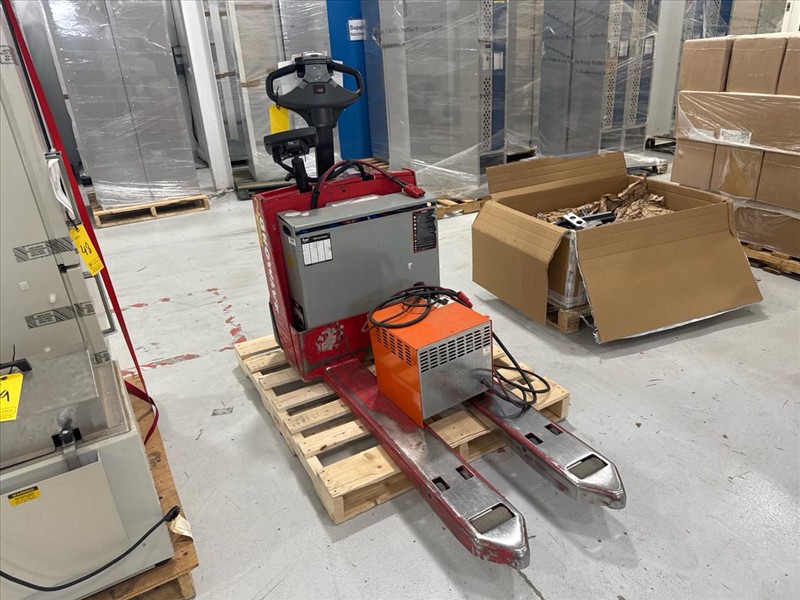 Raymond Electric Pallet Truck, mod. 102T-F45L, ser.no. 102-13-26474, 4500 lbs. cap., 24V c/w Ferro Five battery charger, mod. SFR12A510 CSA, ser.no. E PIC942982, (Needs new battery)