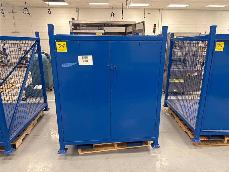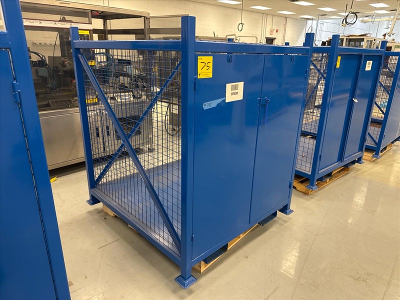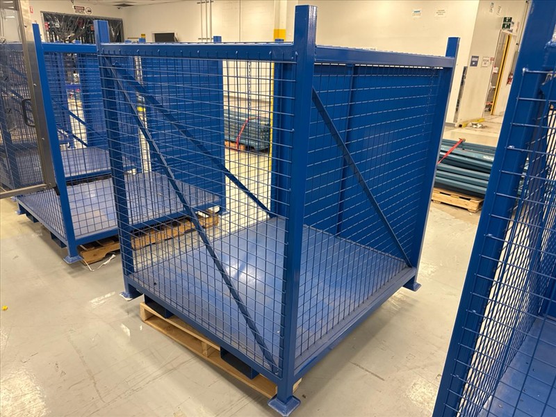 Blue storage cage, approximately 50 in. W x 54 in. D x 59.5 in H. w/ fork slots
