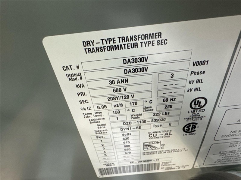 Delta Dry Type transformer, mod. DA3030V, 30 KVA transformer, 208Y/120 volts,