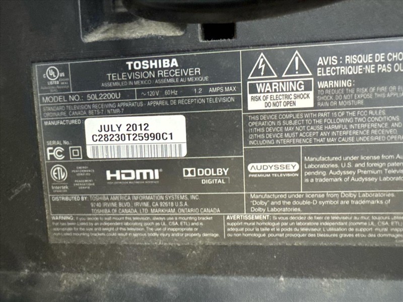 Toshiba Television, 50 in, mod. 50L2200U, ser.no. C28230T25990C1, c/w wall mount (no remote)