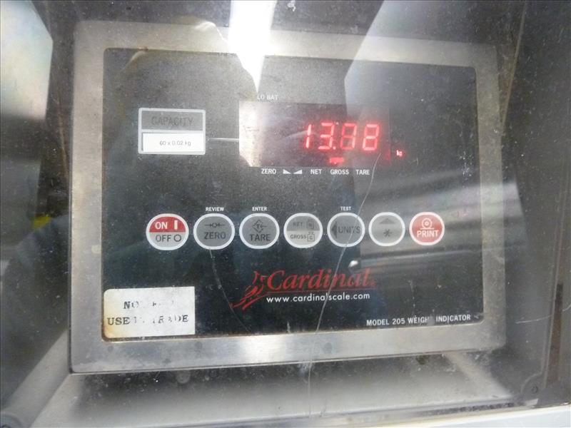 Digital scale w/ Cardinal weight indicator, mod. 205, 60 kg cap., stainless steel platform on casters