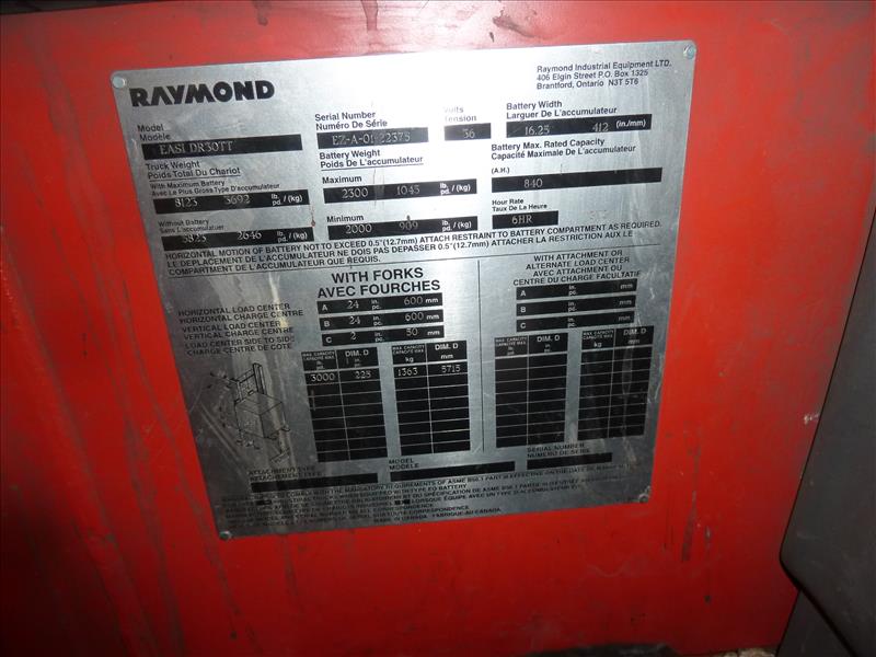 Raymond electric reach forklift truck, side-shifter, model EASI-DR30TT, ser. no. EZ-A-01-22375, 3,000 lbs. cap.
