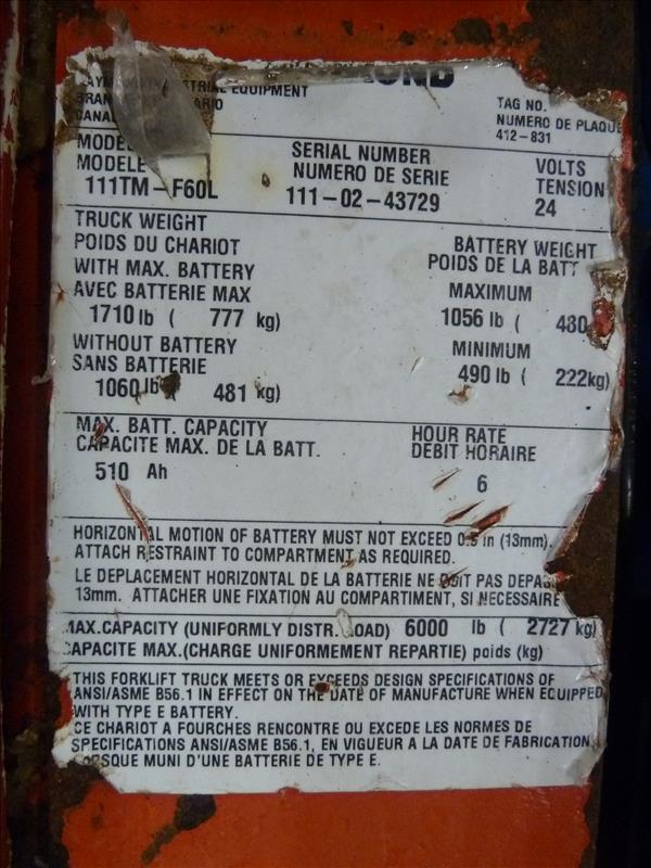 Raymond walk-behind electric pallet truck (no. 6), mod. 111TM-F60L, ser. no. 111-02-43729, 6000 lb. cap., 24V (charger available separately)