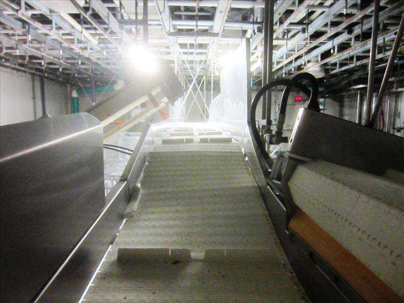 S.S. Suspend Conveyor, 20" W X 30' L flighted intralox belt, 1 1/2 H X 24" spacing, hydraulic operation, s.s. sides & drip pan, hydraulic operation