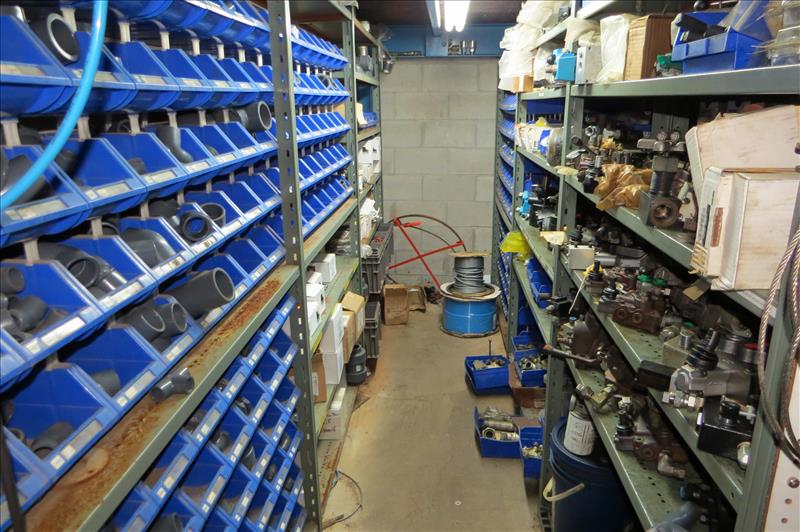 9 Sections Racking w/contents, valves, cylinders, pvc nipples, elbows, etc.