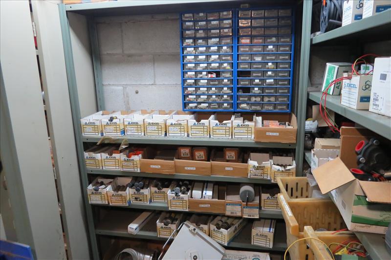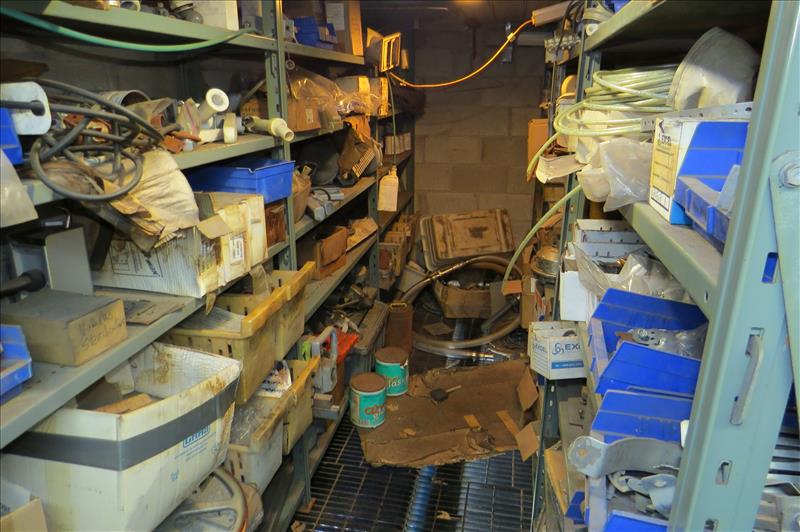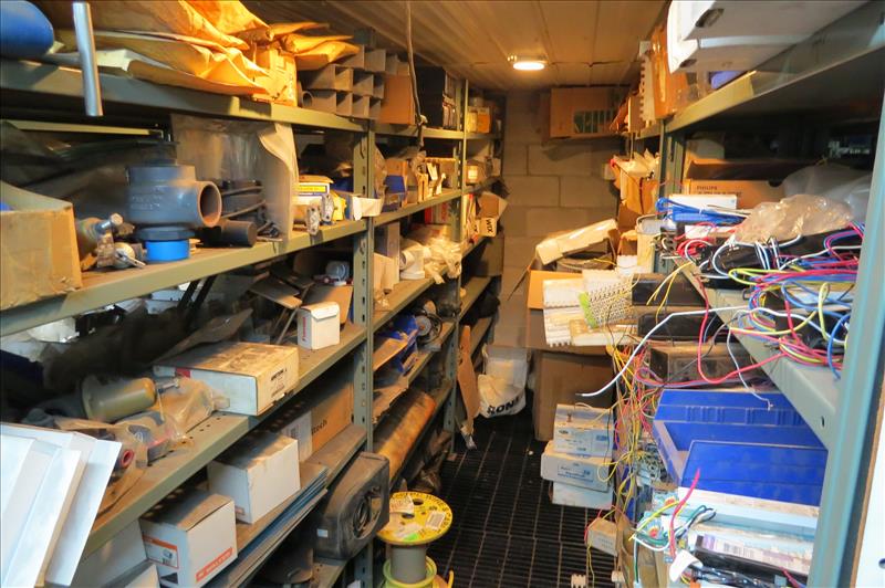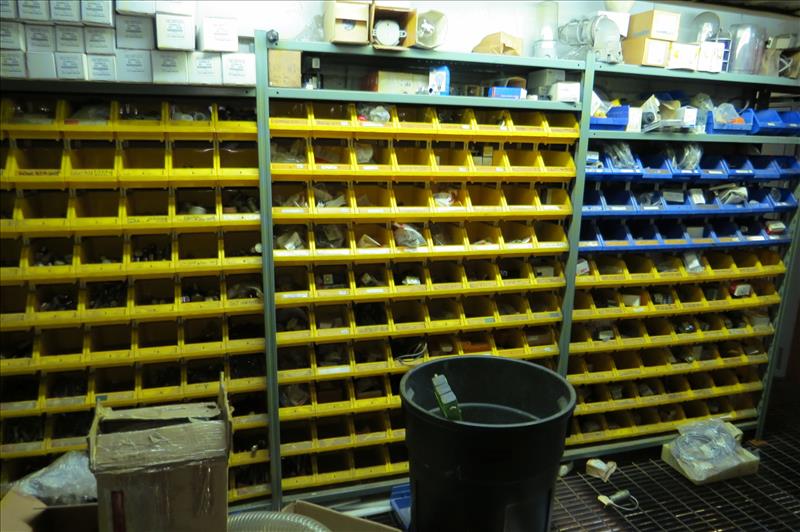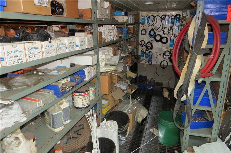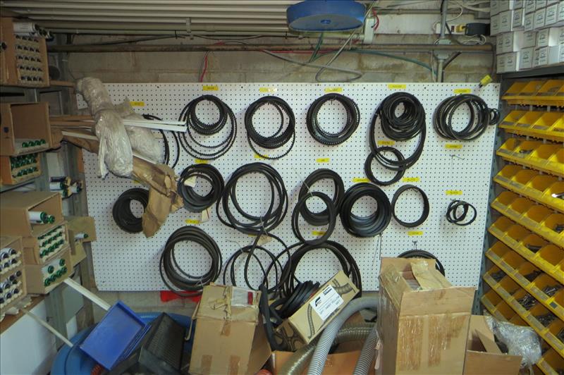 Room of Parts, belts, anti-fatigue mats, vacuum hose, parts bins, shelving units, electrical, fluorescent lights, ballasts, fuses, etc.
