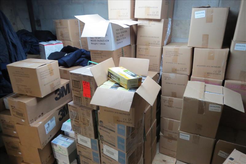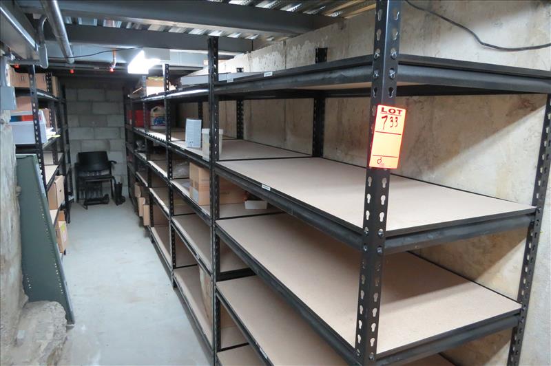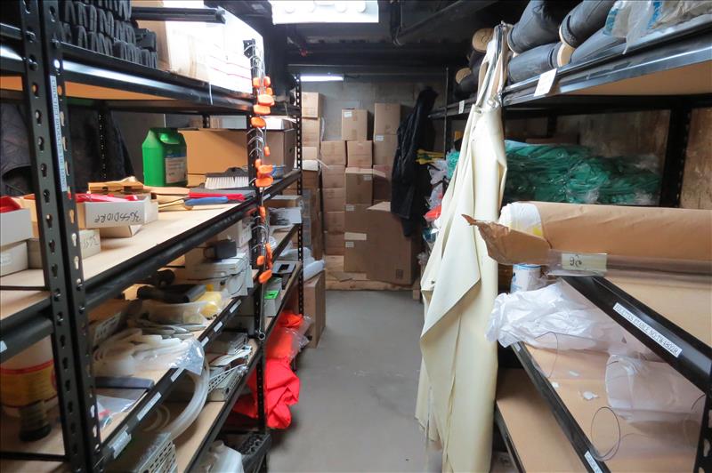 (18) Sections of Racking & Contents, boots, scotch brite pads, food color, soap dispensers, soap, gloves, meat hooks, wrist guards, etc.