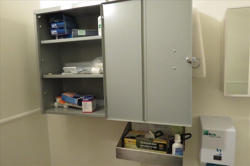 Contents of Infirmiry, cot with bedding and drawers, first aid supplies