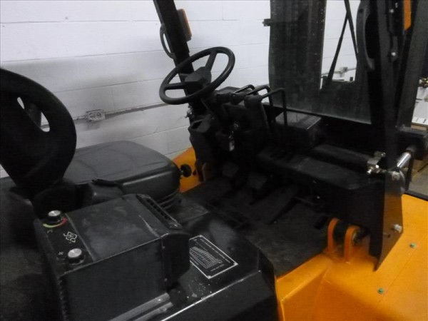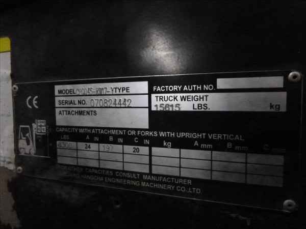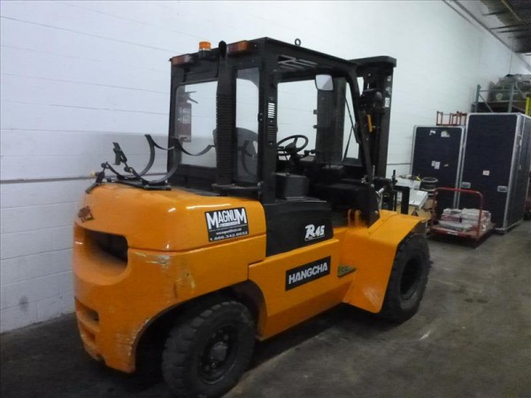 Hangcha R45 Yard Truck (2012), 9000 lbs cap., 390 hrs. showing, propane powered, dual front pneumatic tires, 3-stage mast, side-shift, heated cab (missing doors)