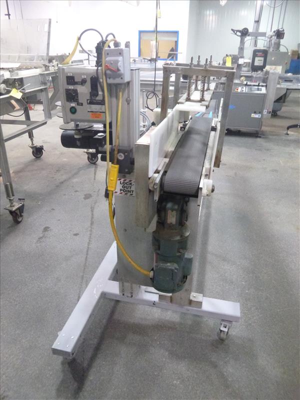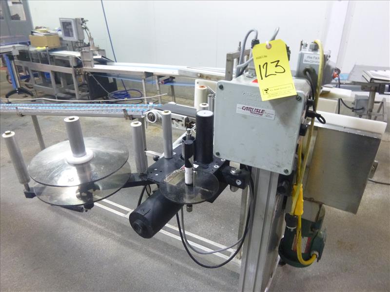 Carlisle Label Applicator mod. UT-2C on casters c/w 4.5 in. x 40 in. conveyor & 72 in. roll-off conveyor