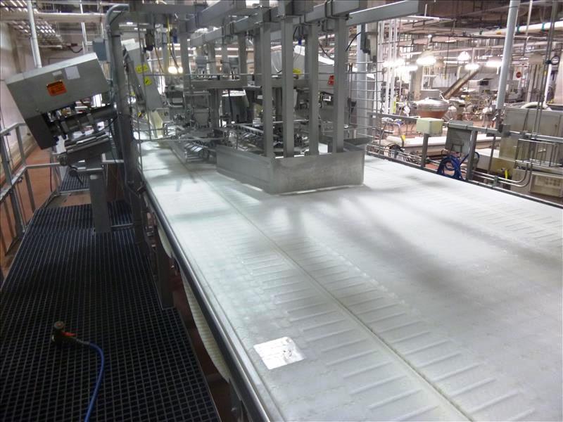 Middle Saw Deboning/Trim Table, tri-lane: (1) 46 in. x 23 ft., (2) 12 in. x 23 ft. Interlox polye belting w/ stainless steel frame