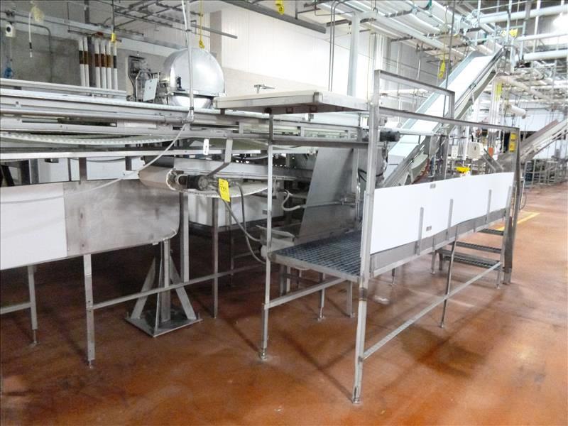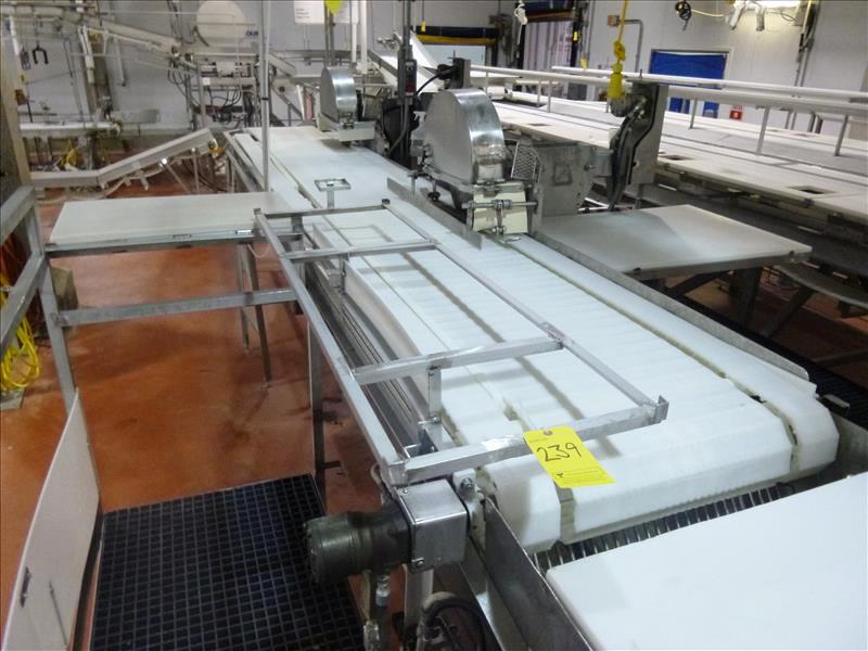 Rib Deboning/Trimming Conveyor Table, tri-lane incl. (1) 20 in. x 18 ft., (2) 4 in. x 18 ft., c/w 20 in. x 20 ft. inclined conveyor & 12 in. x7 ft. w/ stainless steel frame