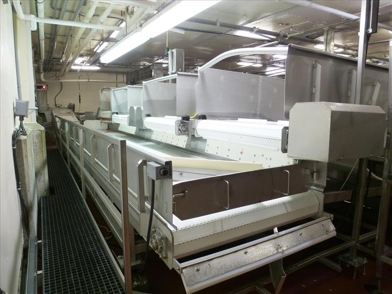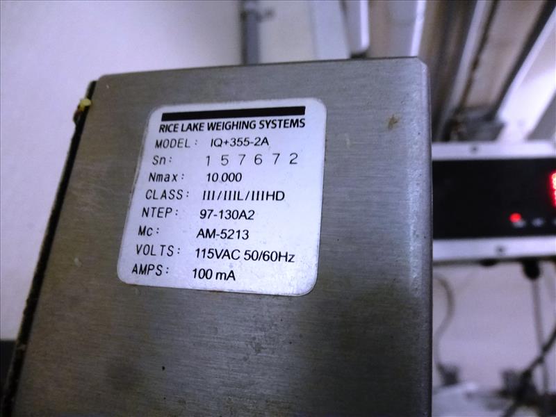 (Meat Batching Line) s/s frame batching belt conveyor c/w: side panels load cells Rice Lake weight indicator model IQ+355-2A & approx. 48 in. W. x 30 ft. L. plastic belt