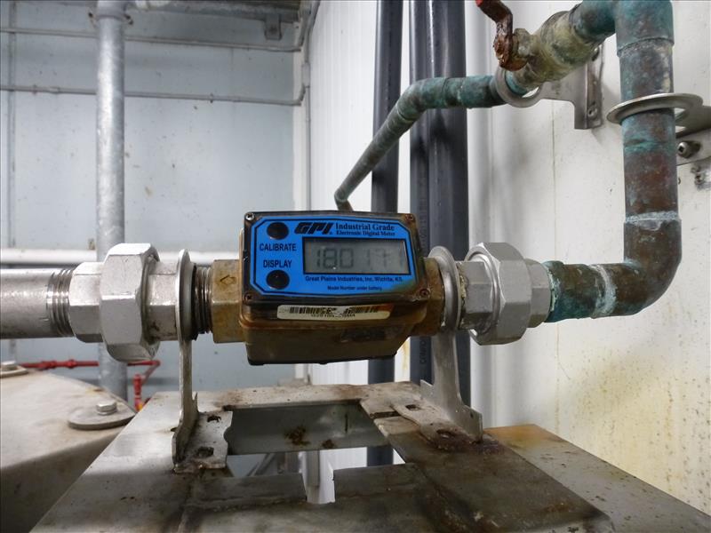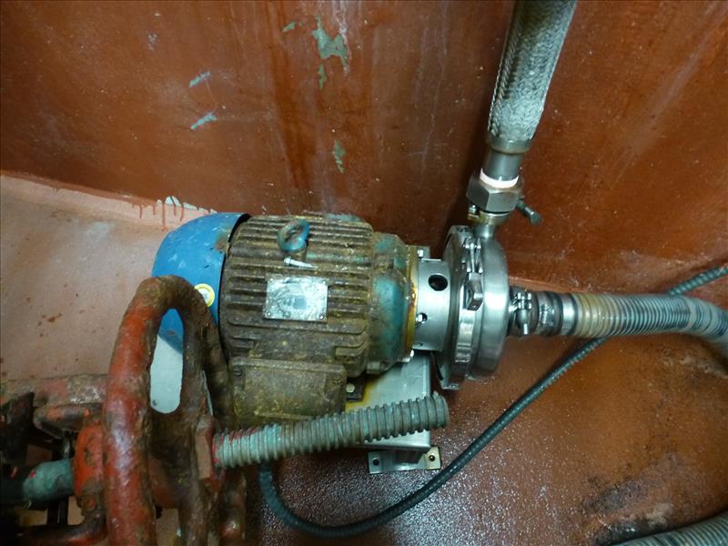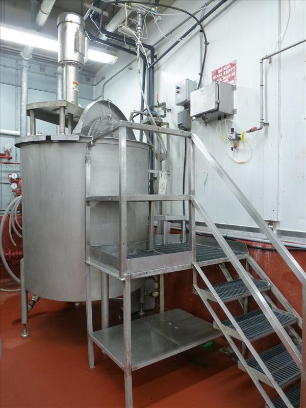 (C.I.M) s/s brine mixing tank 5 ft. Diam. x 5 ft. H. c/w: bridge-mounted s/s Rotosolver mixer s/s centrifugal pump hinged lid GPI flow meter & 5-step s/s elevated operators platform