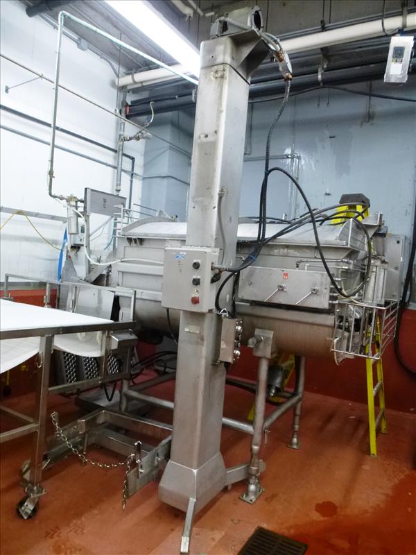 (C.I.M) s/s dual-shaft vacuum ribbon blender approx. 44 in. W. x 72 in. L. x 32 in. D. electric drive c/w: domed cover & s/s column buggy dumper 550 lbs. cap.