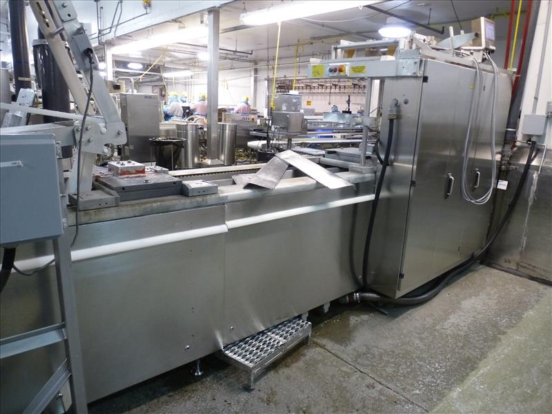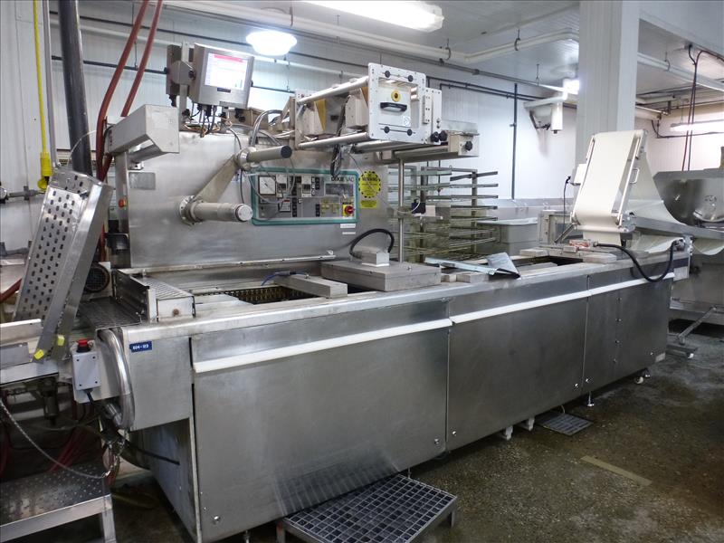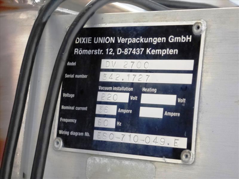 (Slice/Pack Line 1) Dixie Union horizontal rollstock thermoform-fill-seal packaging machine model DV-2700 ser. no. 342-1727 approx. 420 mm. bed width (I.D. no. 604-123) (1) internal vacuum pump c/w: (2) Videojet thermal printers mod. DataFlex+ w/ terminal cutting system & trim collection canister (1) set of tooling, approx. 280 mm. repeat length 2-tracks 1-row vacuum