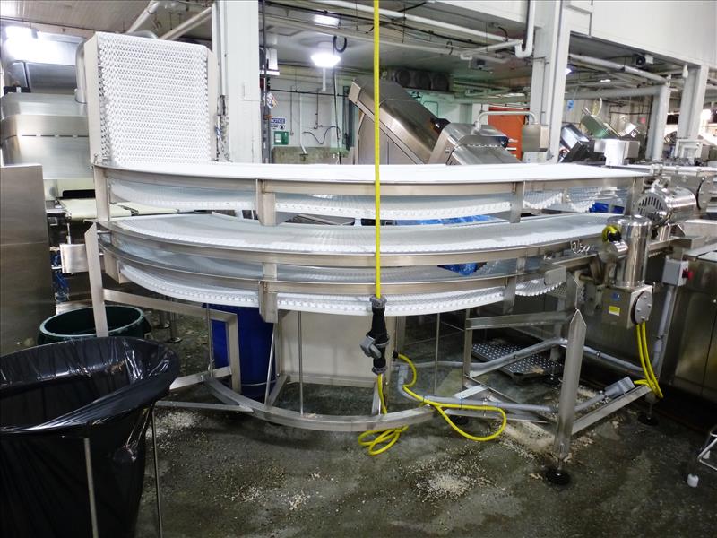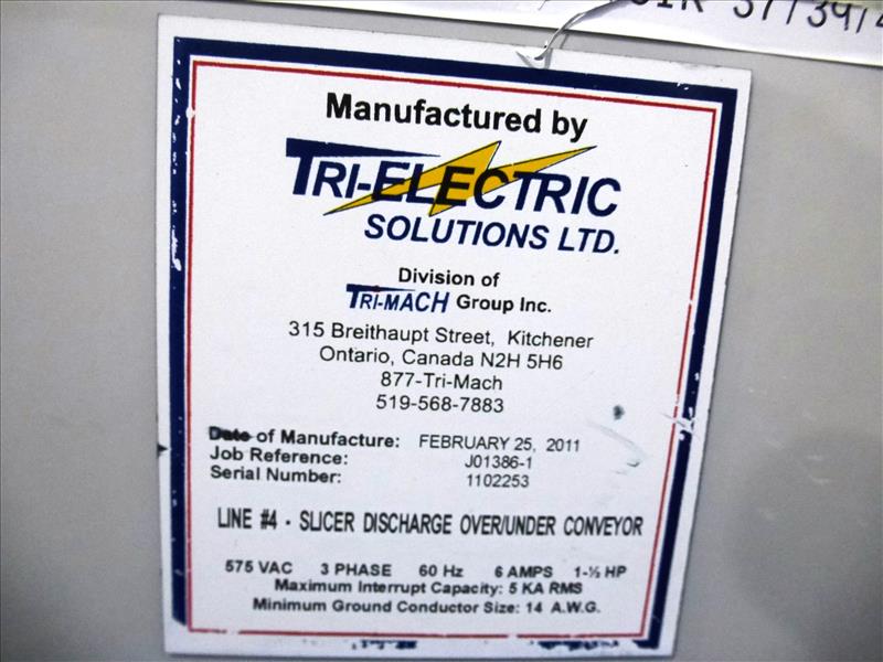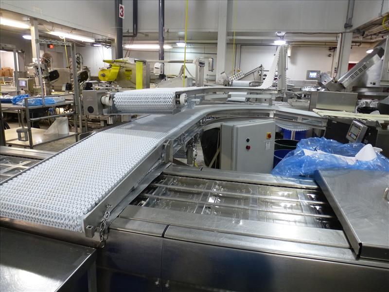 (Slice/Pack Line 4) s/s frame slicer discharge belt conveyor 90-degree turn 2-level over/under c/w: approx. 18 in. W. Intralox plastic belt approx. 12 ft. L. upper level & 20 ft. L. lower level & 2011 Tri-Electric panel