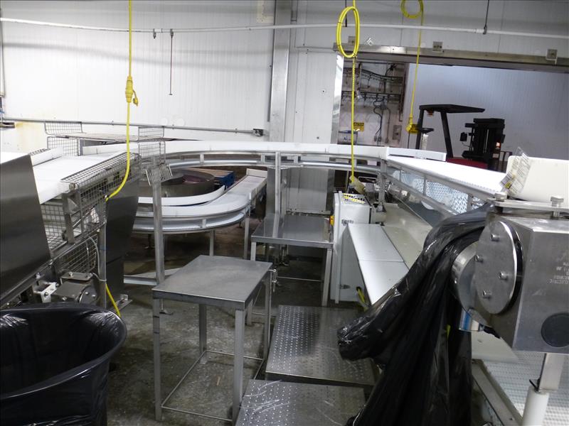 (Slice/Pack Line 4) s/s frame case pack belt conveyor 180-degree turn 2-level c/w approx. 18 in. W. x 15 ft. L. Intralox plastic belt & Tri-Electric panel