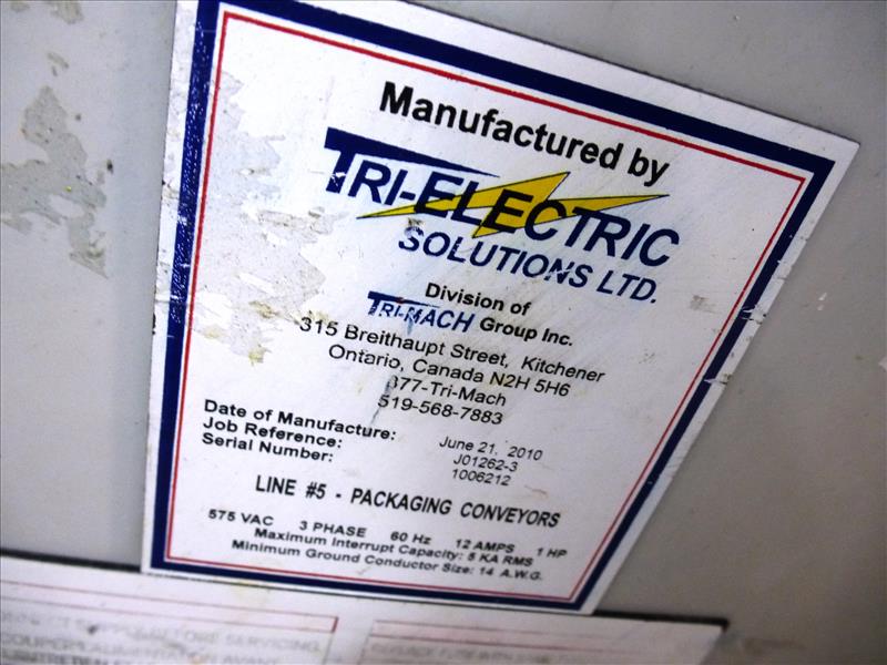 (Slice/Pack Line 6) s/s frame belt conveyor 90-degree turn c/w approx. 12 in. W. x 12 ft. L. Intralox plastic belt side tables & 2010 Tri-Electric panel