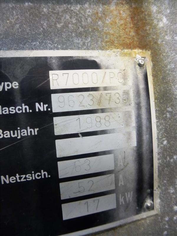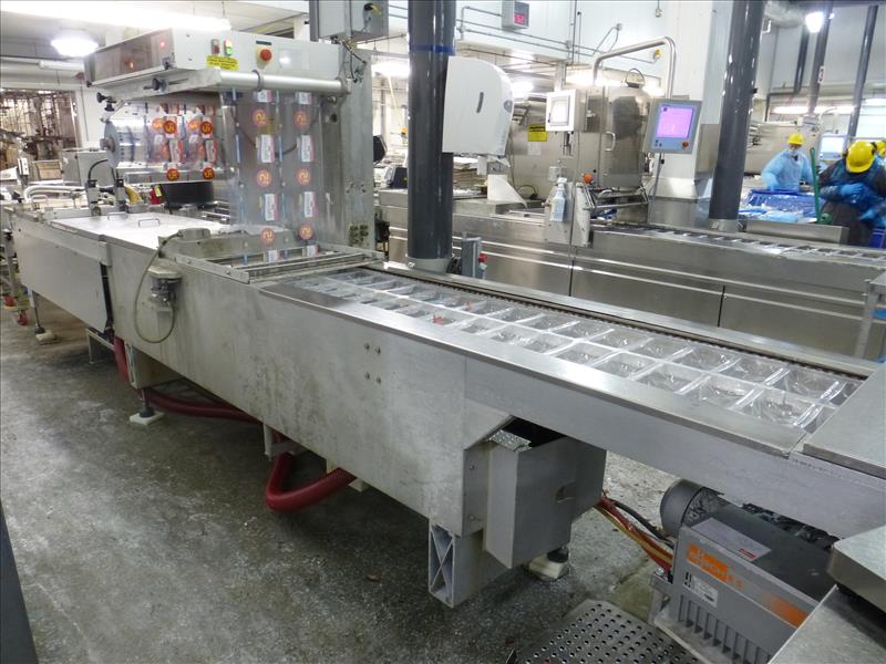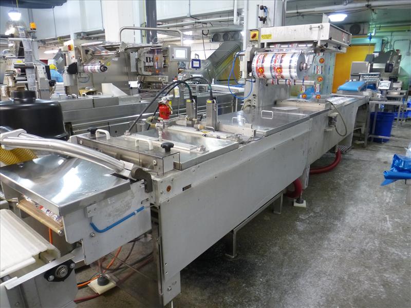 (Slice/Pack Line 7) Multivac horizontal rollstock thermoform-fill-seal packaging machine model R7000/PC ser. no. 9623/735 approx. 459 mm. bed width c/w: gas flush (1) internal vacuum pump cutting system & trim collection canister (2) sets of tooling, approx. 310 mm. repeat length 2-tracks 2-rows (500 gm.) 2-tracks 1-row (1 kg.) gas flush & (1) approx. 235 mm repeat length 2-tracks 1-row gas flush