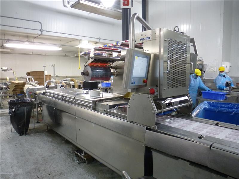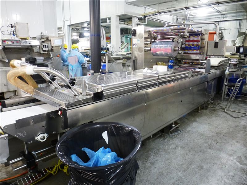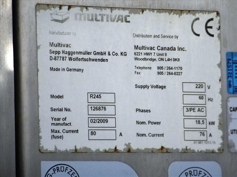(Slice/Pack Line 9) 2009 Multivac s/s horizontal rollstock thermoform-fill-seal packaging machine model R245 ser. no. 126876 approx. 420 mm. bed width c/w: gas flush (1) internal vacuum pump Videojet Dataflex+ thermal printer w/ terminal MR printer traverse unit model 293 cutting system & trim collection canister & (6) sets of tooling incl.: (1) set of tooling, approx. 300 mm. repeat length, 2-tracks, 1-row, vacuum (1) set of tooling, approx. 300 mm. repeat length, 2-tracks, 1-row, gas flush (1) set of tooling, approx. 300 mm. repeat length, 2-tracks, 2-rows, gas flush (1) set of tooling, approx. 300 mm. repeat length, 4-tracks, 2-rows, vacuum (1) set of tooling, approx. 300 mm. repeat length, 3-tracks, 2-rows, gas flush (1) set of tooling, approx. 500 mm. repeat length, 2-tracks, 3-rows, gas flush