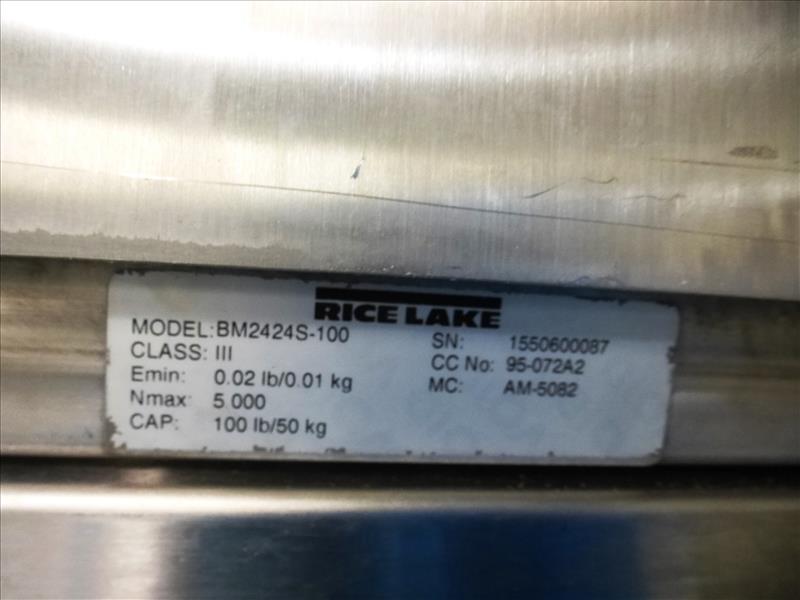 (Slice/Pack Line 9) Carlisle s/s touchscreen control workstation c/w: Datamax label printer Rice Lake 24 in. x 24 in. 100 lbs. cap. s/s inline platform scale w/ plastic conveyor rollers model BM2424S-100 & weight indicator model IQplus355