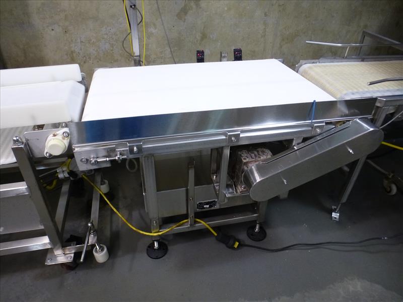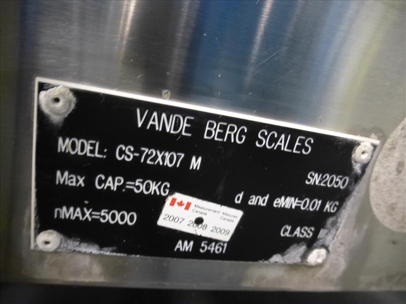 (Cryovac Line 12) Vande Berg s/s frame inline conveyor scale model CS-72X107M ser. no. 2050 50 kg. cap. c/w: 30 in. W. x 40 in. L. Intralox belt & Weigh-Tronix weight indicator model WI-127 ser. no. 021588