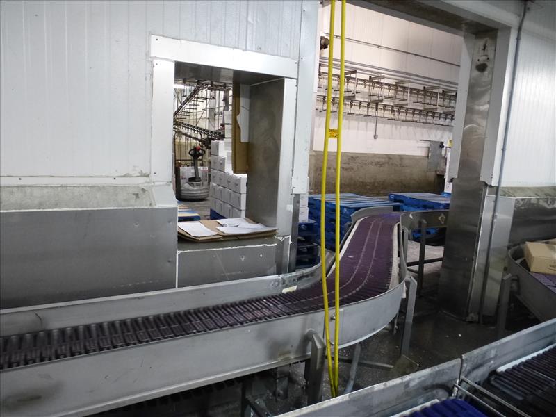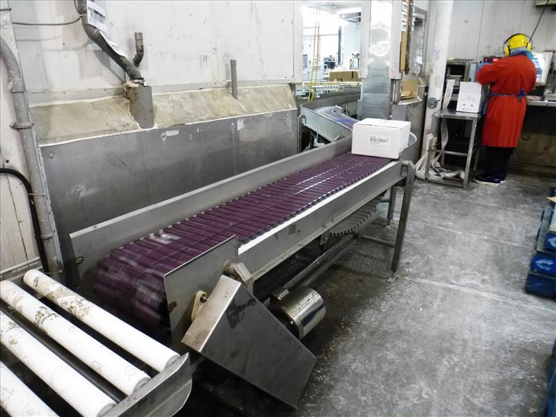 s/s frame belt conveyor c/w: 12 in. W. purple plastic belt w/ small rollers side rails & 45-degree turn (length to be determined)