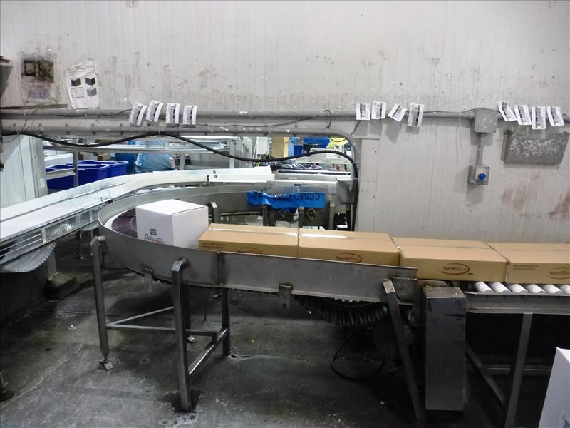 s/s frame belt conveyor c/w: 12 in. W. purple plastic belt w/ small rollers side rails 45-degree turn & 180-degree turn (length to be determined)