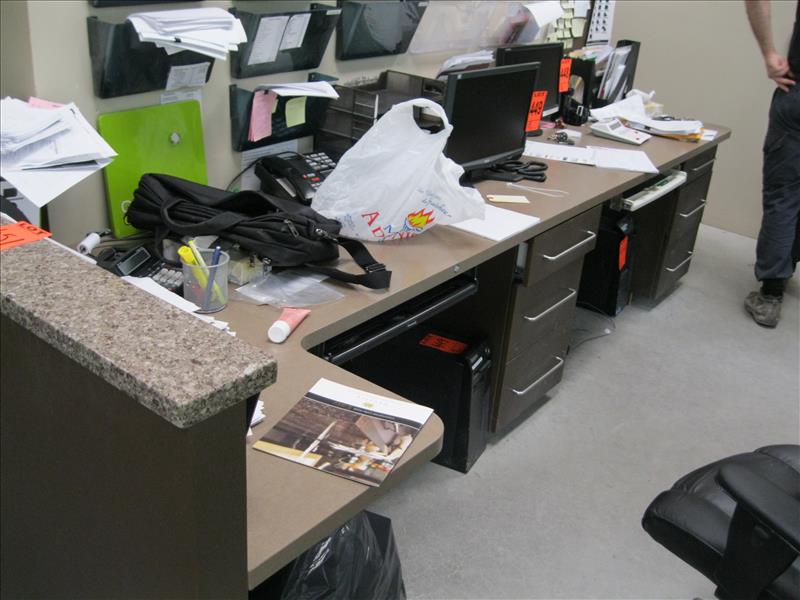 1 reception counter, 1 workstation, 3 chairs, 1 filing cabinet