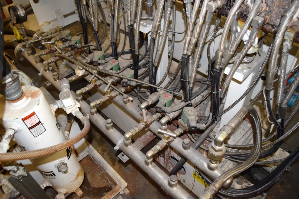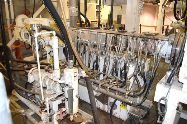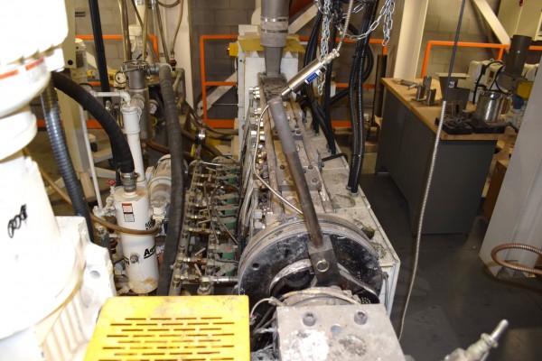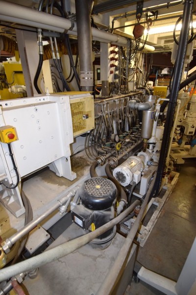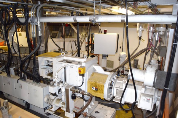 Coperion 40mm MEGAcompounder Twin Screw Extruder, Type ZSK-40MC. Approximate 40 to 1 L/D ratio. Co-Rotating intermeshing side by side screw design. 10 Barrel sections consisting of (1) feed section with hopper, (4) top vented (plugged), (2) with side feeder ports. Electrically heated, water cooled with a Coperion type CU-115K closed loop cooling system. Extruder driven by a 75hp Allen-Bradley inverter duty motor thru a Flender gearbox, ratio 3.133 to 1. Approximate 44in. centerline height. Includes a manual screen changer, (1) control panel with an Allen-Bradley SLC 5/05 CPU, Eurotherm 2216e temperature controllers, Allen-Bradley 1336 Impact drive, and an Advantech operator panel. Extruder mounted on casters. Built 2000, machine# 03-3168-1000-0101, project# 03-3168.