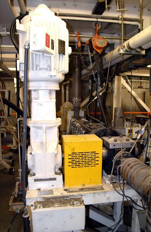 Zenith Gear Pump, Model 60-20000-2084-4. Capacity PEP II 100CC/revolution. Speed range 2.87 to 57.84. Driven by a 20hp, 3/60/460 volt, 1770 rpm motor with reducer. SO# 644002JM. Last used with a 40mm twin screw extruder.