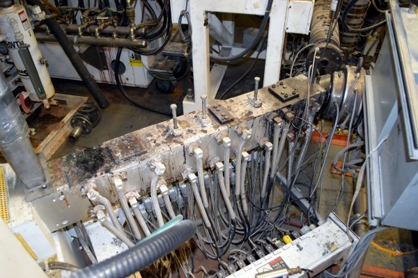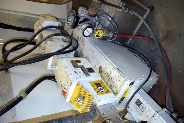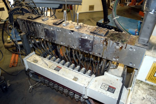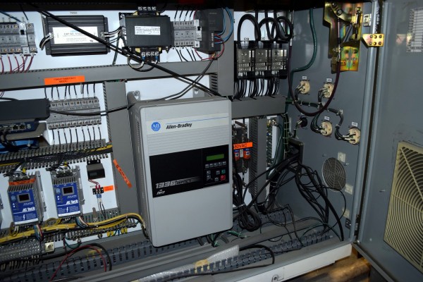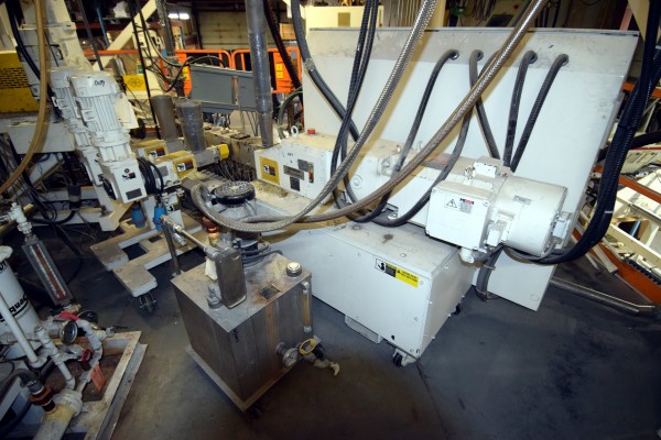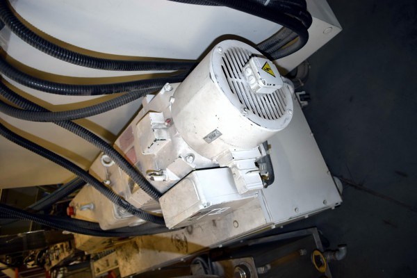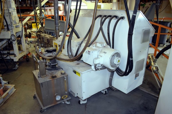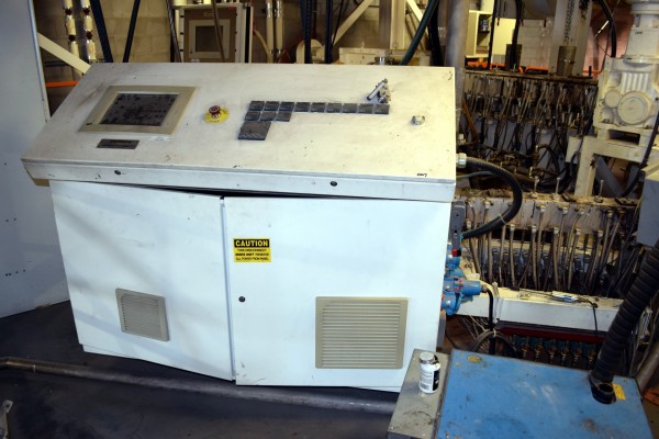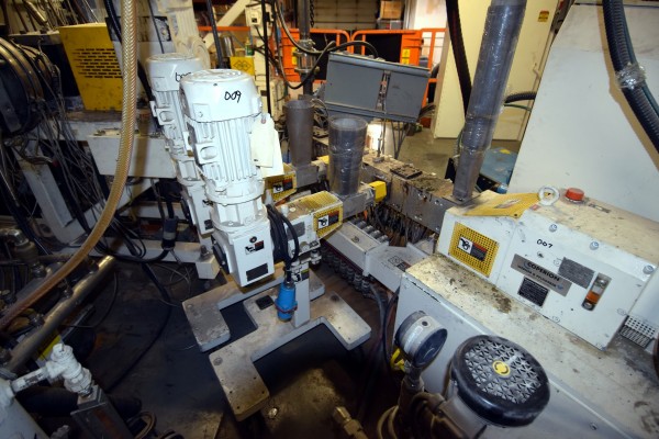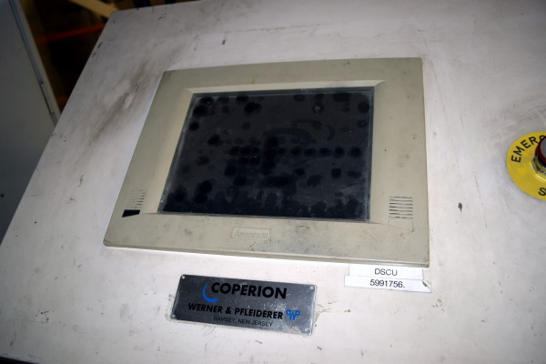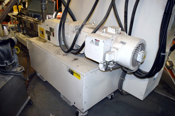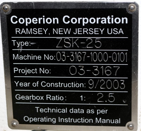 Coperion 25mm Twin Screw Extruder, Type ZSK-25. Approximate 40 to 1 L/D ratio. Co-Rotating intermeshing side by side screw design. 10 Barrel sections consisting of (1) feed section with hopper, (4) top vented (plugged), (2) with side feeder ports. Electrically heated, water cooled with a Coperion type CU-15K closed loop cooling system. Extruder driven by a 22kw Allen-Bradley inverter duty motor thru a PIV gearbox, ratio 2.5 to 1. Approximate 27in. centerline height. Includes (1) control panel with an Allen-Bradley SLC 5/05 CPU, Eurotherm 2216e temperature controllers, Allen-Bradley 1336 Impact drive, and an Advantech operator panel. Extruder mounted on casters. Built 2003, machine# 03-3167-1000-0101, project# 03-3167.