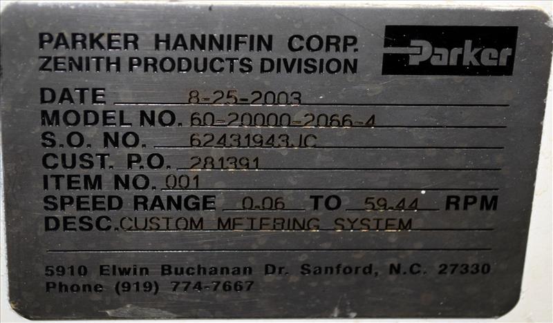 Zenith Gear Pump, Model 60-20000-2066-4. Speed range 0.06 to 59.44. Driven by a 3hp, 3/60/460 volt, 1755 rpm motor with reducer. SO# 62431943JC, built 2003. Last used with a 25mm twin screw extruder.