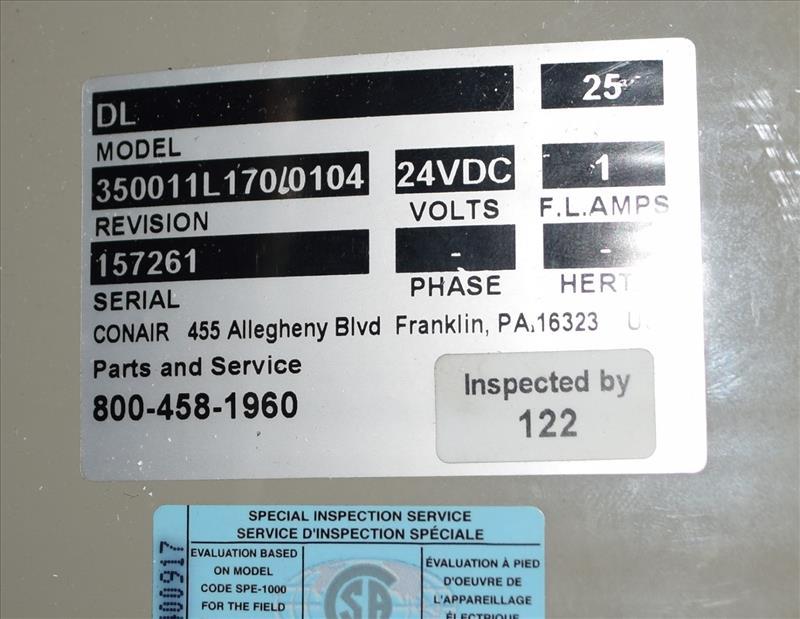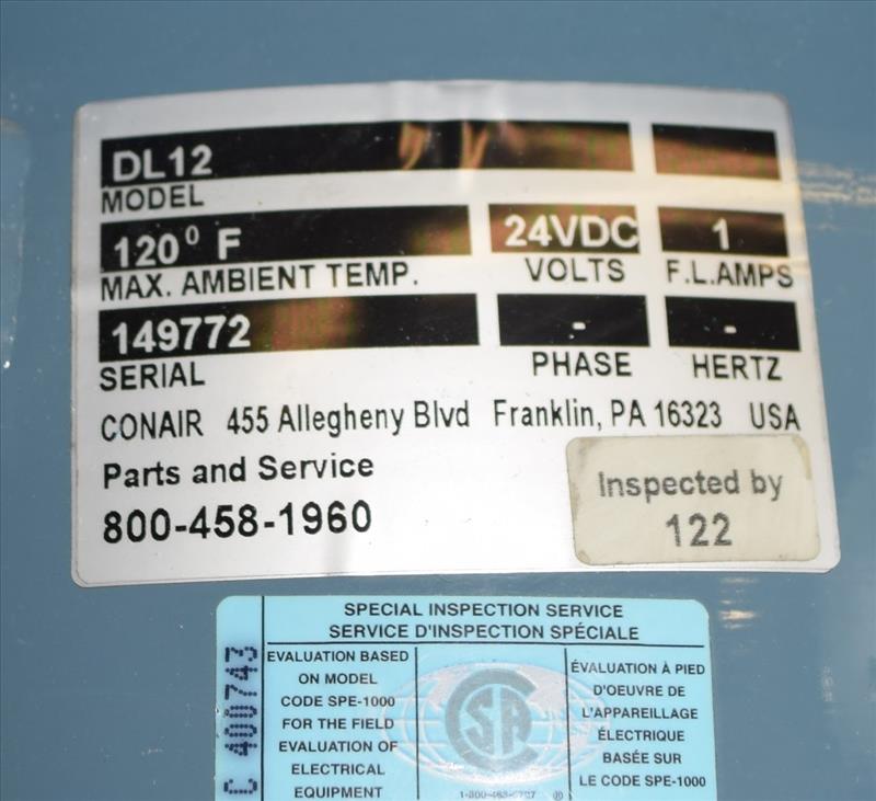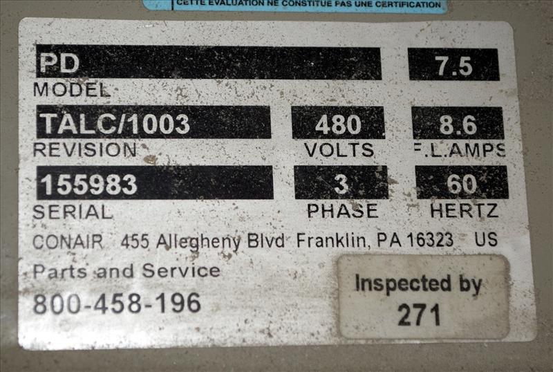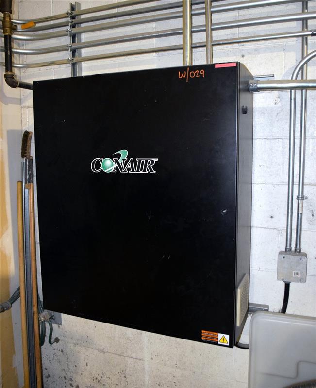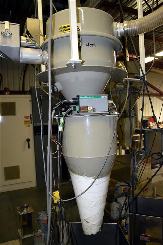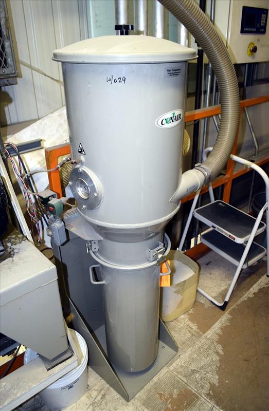 Conair Vacuum Loading System, Model PD, Serial# 155983. Consisting of: (1) Sutorbilt Legend Series horizontal rotary positive displacement blower, model 34MQ-29045309, serial# S161929. Driven by a 7.5hp, 3/60/208-230/460 volt, 3500 rpm motor. (1) Silencer, (1) Conair dust collector, model DC1, serial# 156975, (1) Conair DL12, (1) DL15, (1) DL25 vacuum loaders, (1) hose distribution panel, (1) control panel.