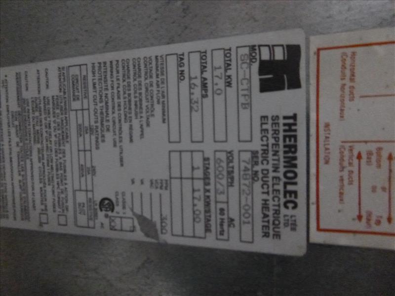 Thermolec electric duct heater, mod. SC-CTPB, ser. no. 74872-001