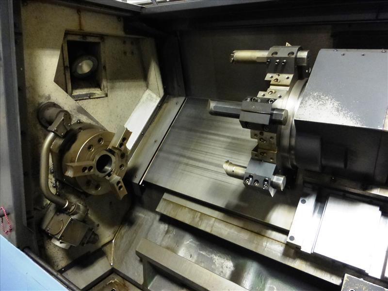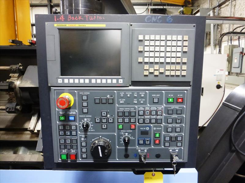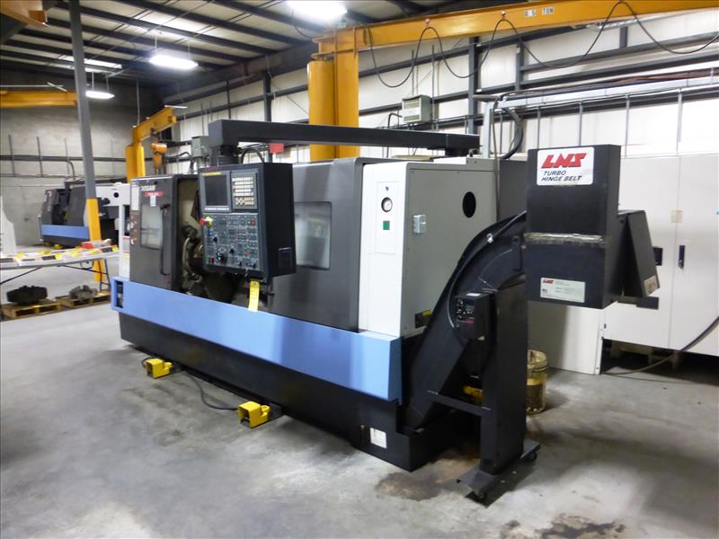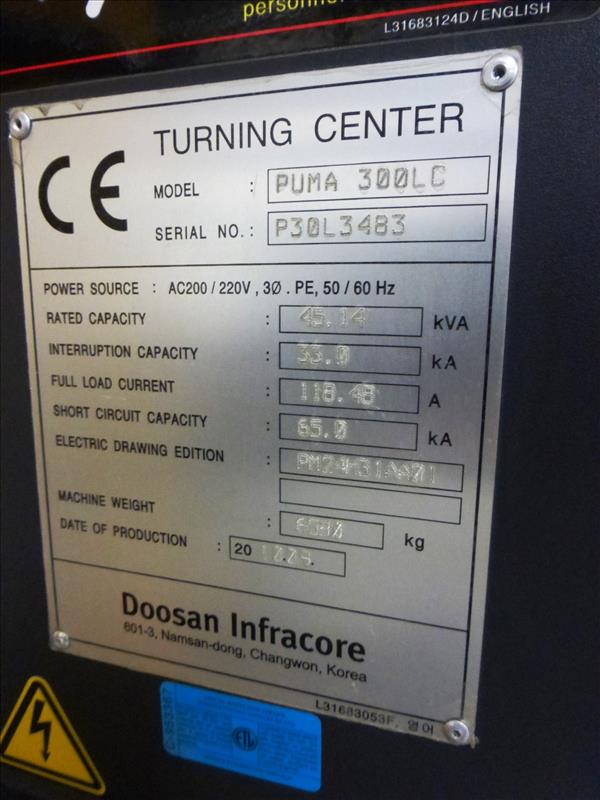 Doosan mod. Puma 300LC CNC turning center, ser. no. P30L3483 (2010), LNS Turbo Hinge Belt chip conveyor, Doosan-Fanuc i Series control, 12-position tool turret, 3-jaw chuck, tailstock, hydraulic steadyrest (CNC-6), Run Time: 11,860 hours