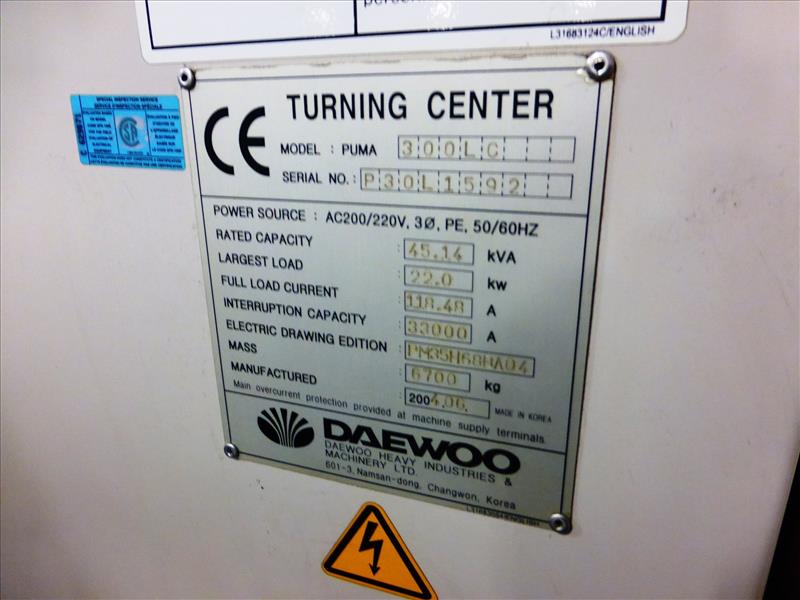 Daewoo mod. Puma 300LC CNC turning center, ser. no. P30L1592 (2004), Turbo Systems chip conveyor, Fanuc Series 21i-TB control, 10-position tool turret, 3-jaw chuck, tailstock, (CNC-1)