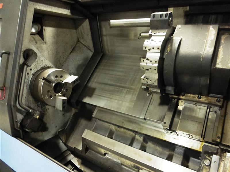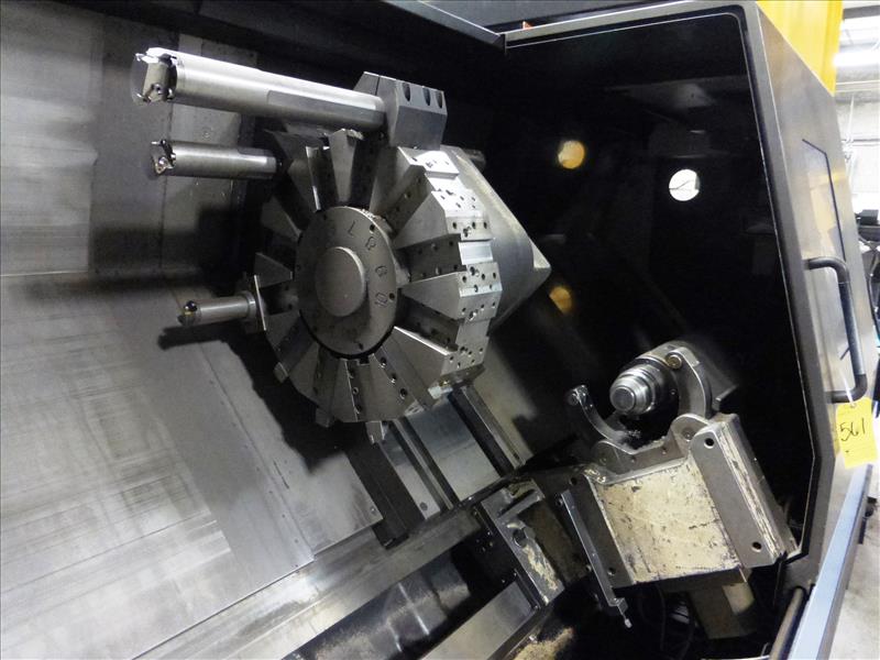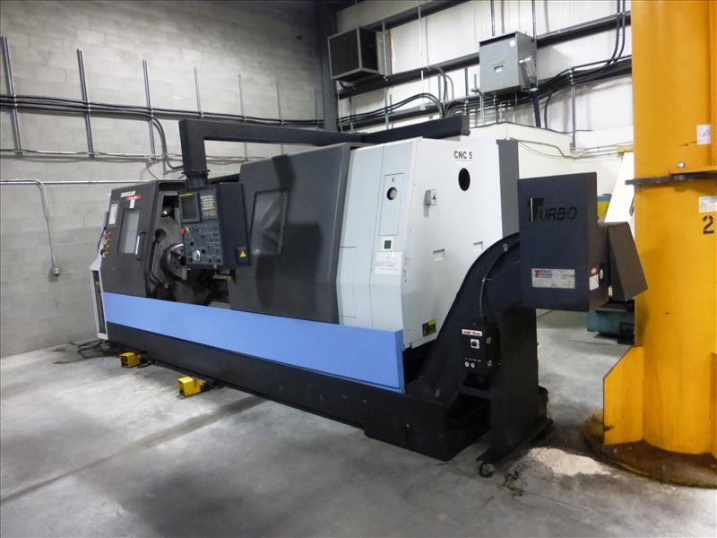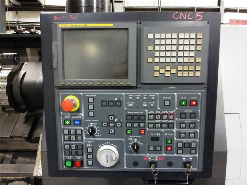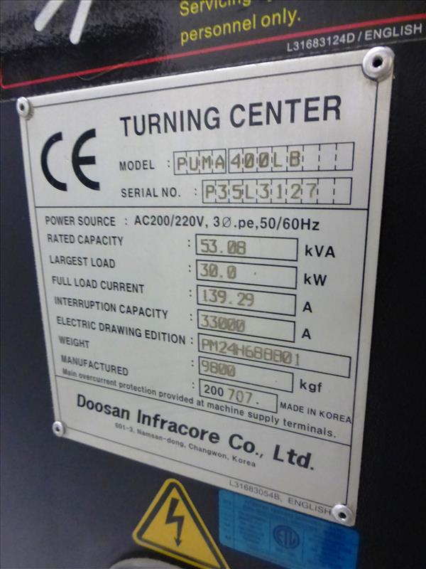 Doosan mod. Puma 400LB CNC turning center, ser. no. P35L3127 (2007), Turbo Systems chip conveyor, Fanuc Series 21i-TB control, 12-position tool turret, 3-jaw chuck, tailstock, hydraulic steady rest, (CNC-5), Operating Time: 18,400 hours