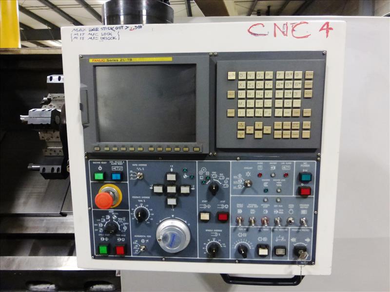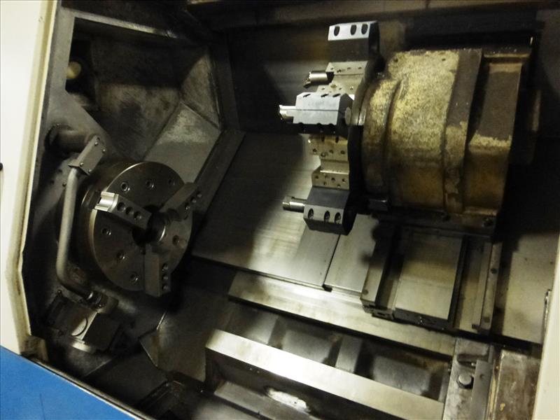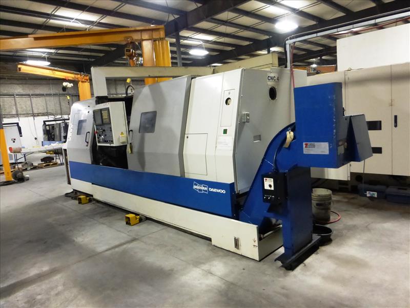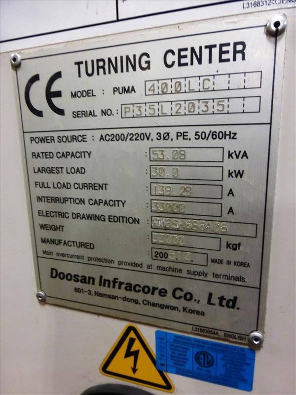 Doosan mod. Puma 400LC CNC turning center, ser. no. P35L2035 (2005), Turbo Systems chip conveyor, Fanuc Series 21i-TB control, 12-position tool turret, 3-jaw chuck, tailstock, hydraulic steady rest, (CNC-4), Operating Time: 25,834 hours