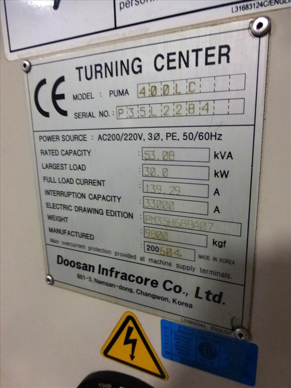 Doosan mod. Puma 400LC CNC turning center, ser. no. P35L2284 (2006), Turbo Systems chip conveyor, Fanuc Series 21i-TB control, 12-position tool turret, 3-jaw chuck, tailstock, (CNC-3)