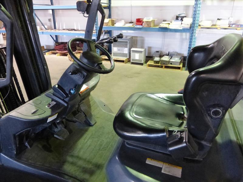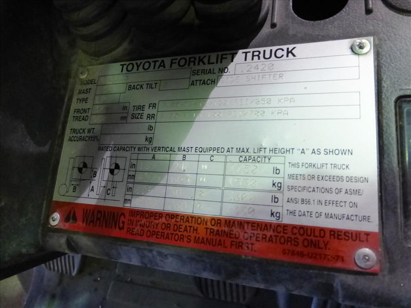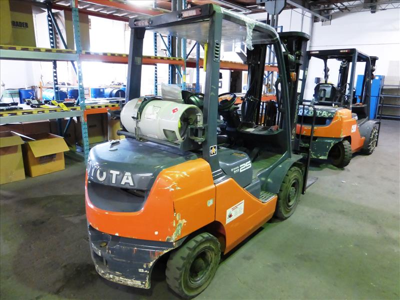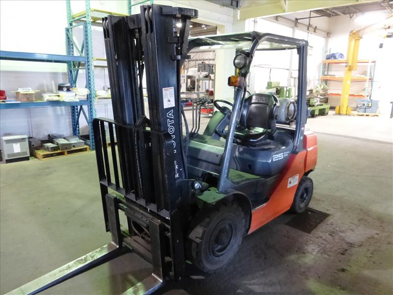 Toyota 25 propane forklift truck, mod. 8FGU25, ser. no. 12420, indoor-outdoor, 3-stage mast, side-shifter, 3750 lb. cap., 1989 hrs. c/w winter chains