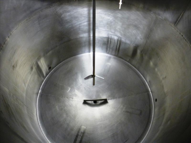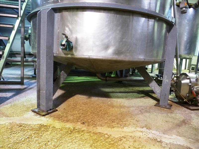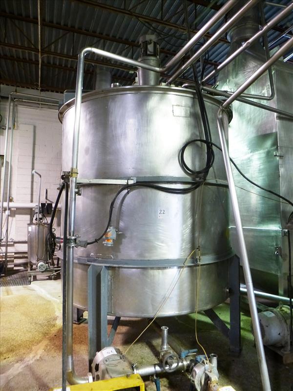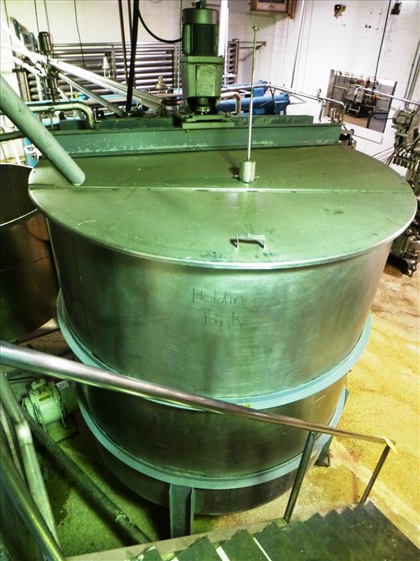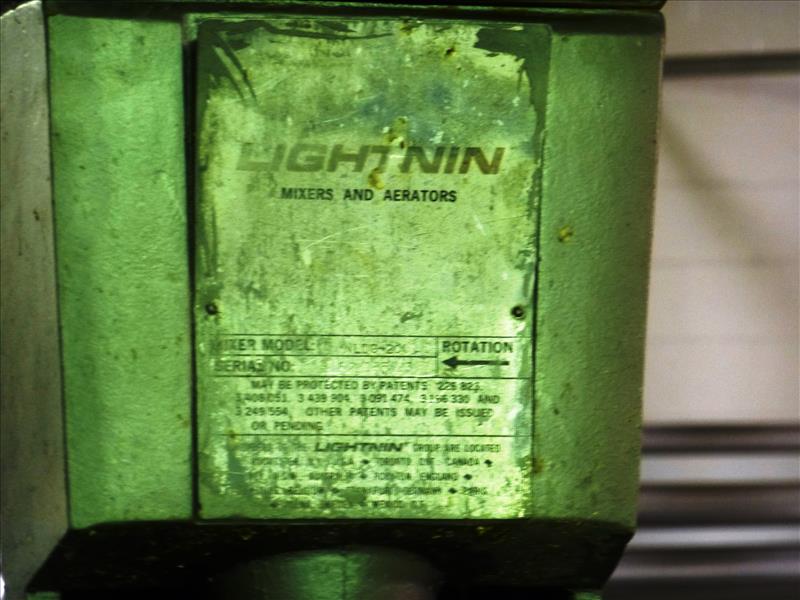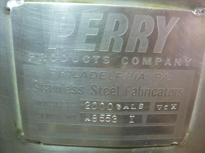 Perry Products s/s mixing tank, mod. VCX, ser. no. A8553 I, 2,000 USG., approx. 6' diam. x 7' high straight side c/w s/s hinged cover, Lightnin bridge-mounted mixer, mod. NLDG200 & steel support stand