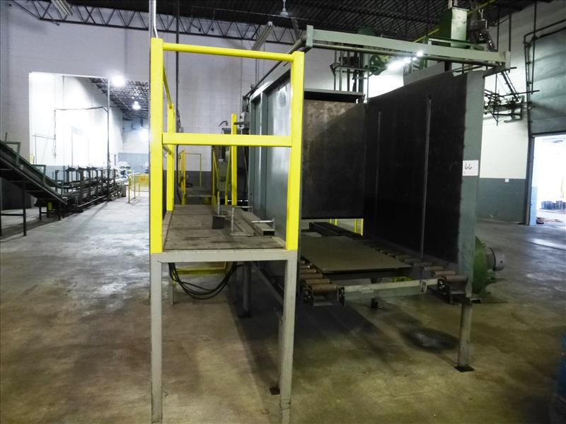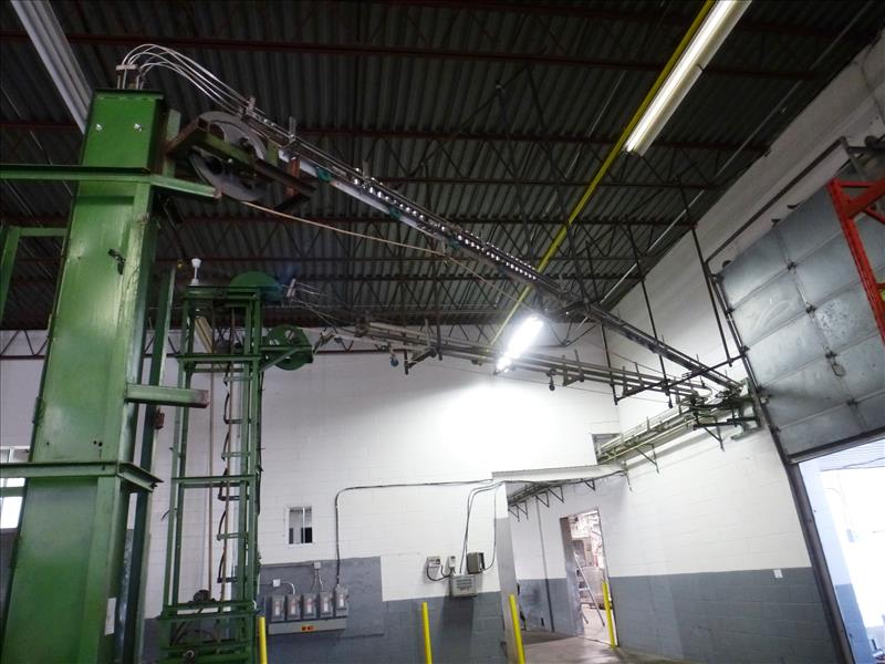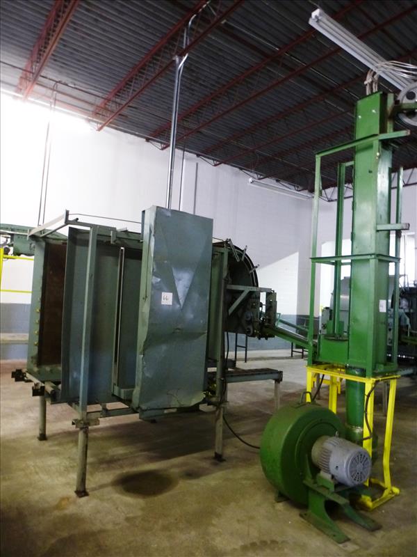 Small Can Depalletizng Line, incl.: (1) can de-palletizer & (1) pneumatic blower elevator with 15 h.p. blower & (1) approx. 90' long elevated can cable conveyor