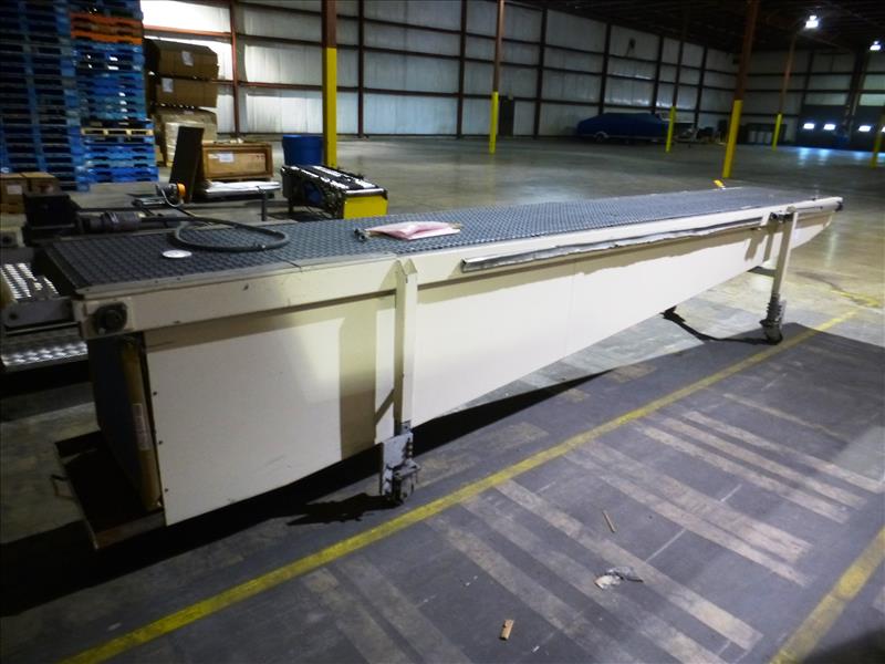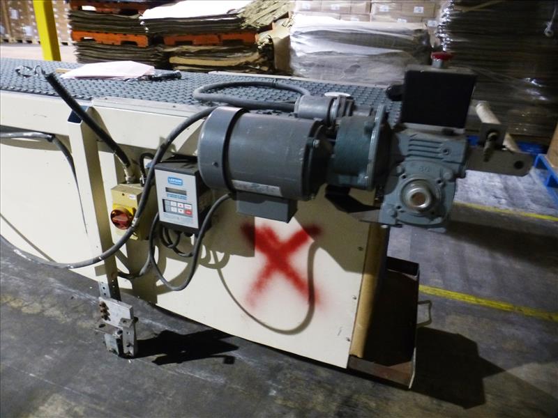variable speed chain belt conveyor on casters, approx. 15' long x 2' wide c/w Leeson variable speed control