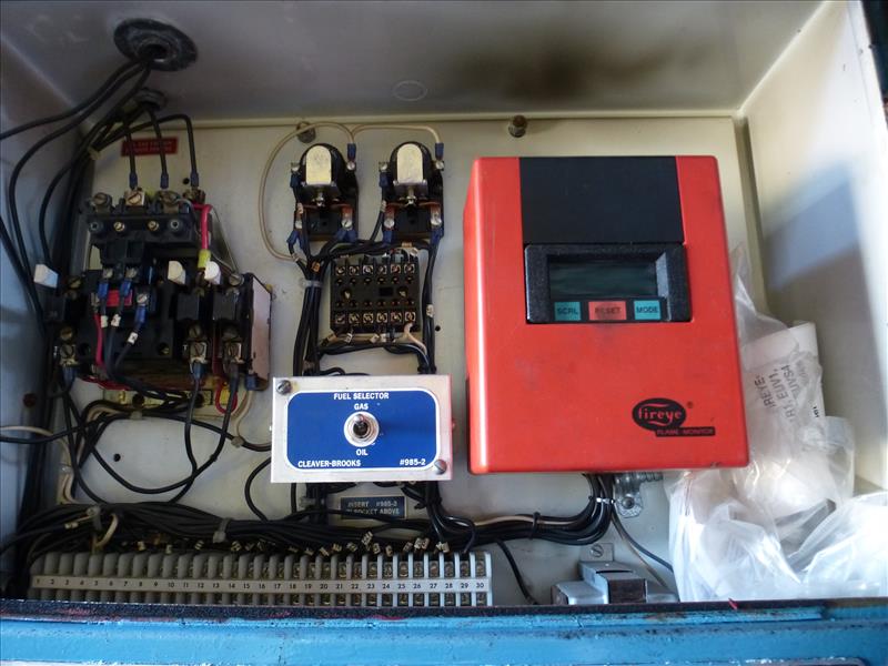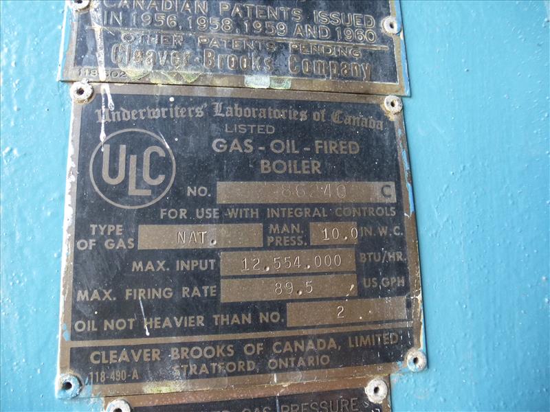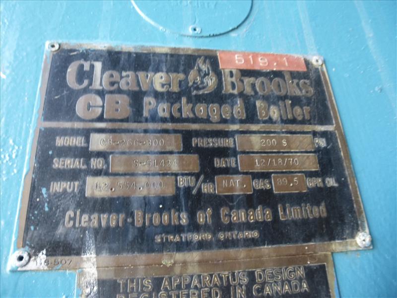Cleaver Brooks natural gas-fired steam boiler, mod. CB648-600, ser. no. S-25592, 200 psi. c/w Fireye flame monitor. ITEM TO BE DISCONNECTED AT STACK. STACK TO REMAIN IN CEILING.